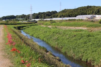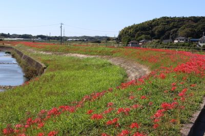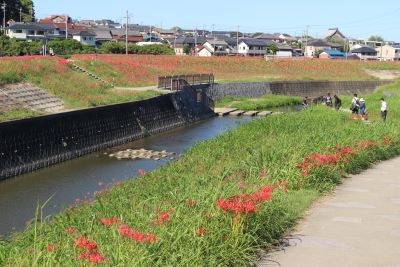 "南吉がよく散策した矢勝川の堤をキャンバスに、彼岸花で真っ赤な風景を描こう"