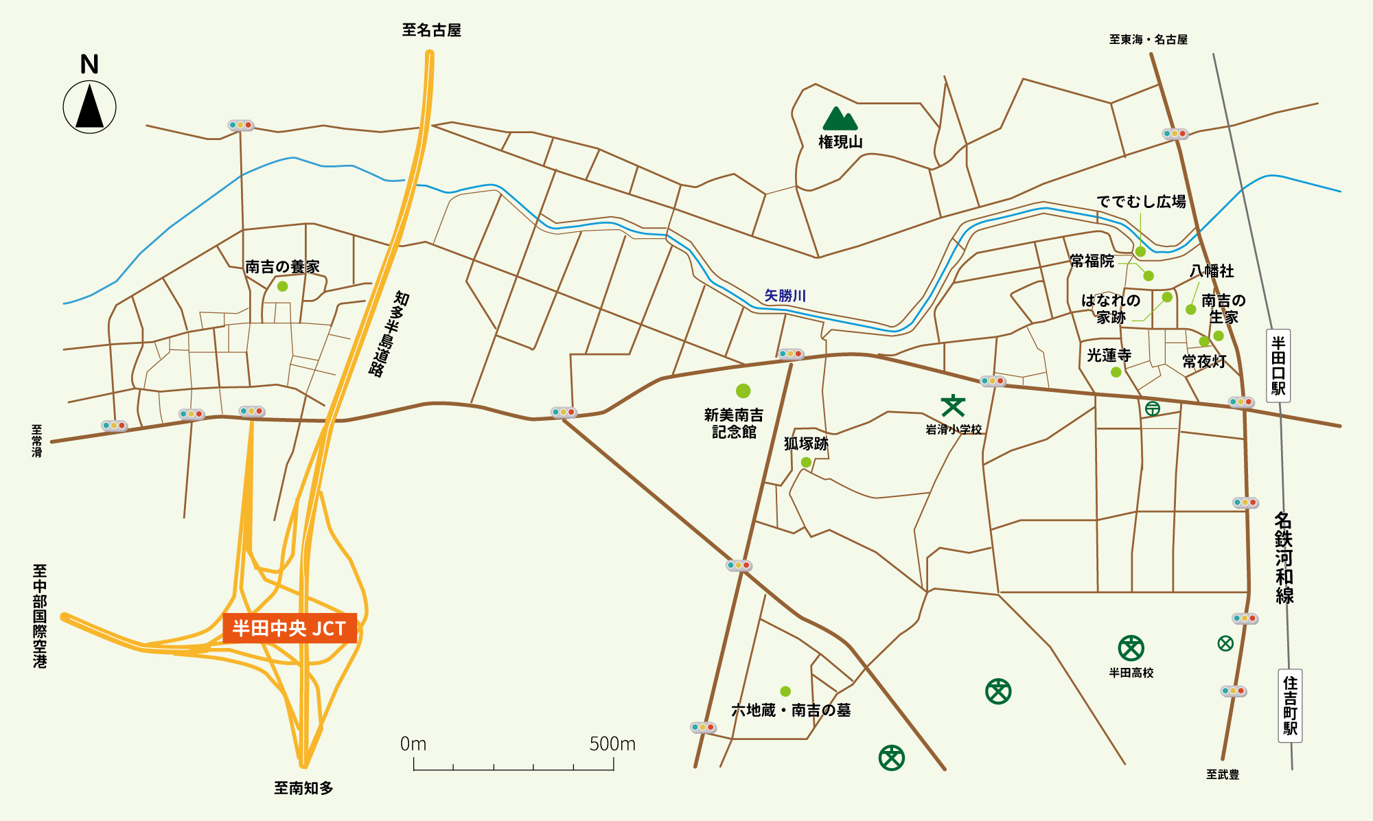 新美南吉記念館→生家駐車場…南吉生家…常夜灯…岩滑八幡社・宝蔵倉跡…赤い井戸…はなれの家跡…常福院…ででむし広場・矢勝川(権現山をのぞむ)…南吉生家駐車場→南吉の墓・六地蔵→狐塚碑→岩滑小学校・ごん狐碑